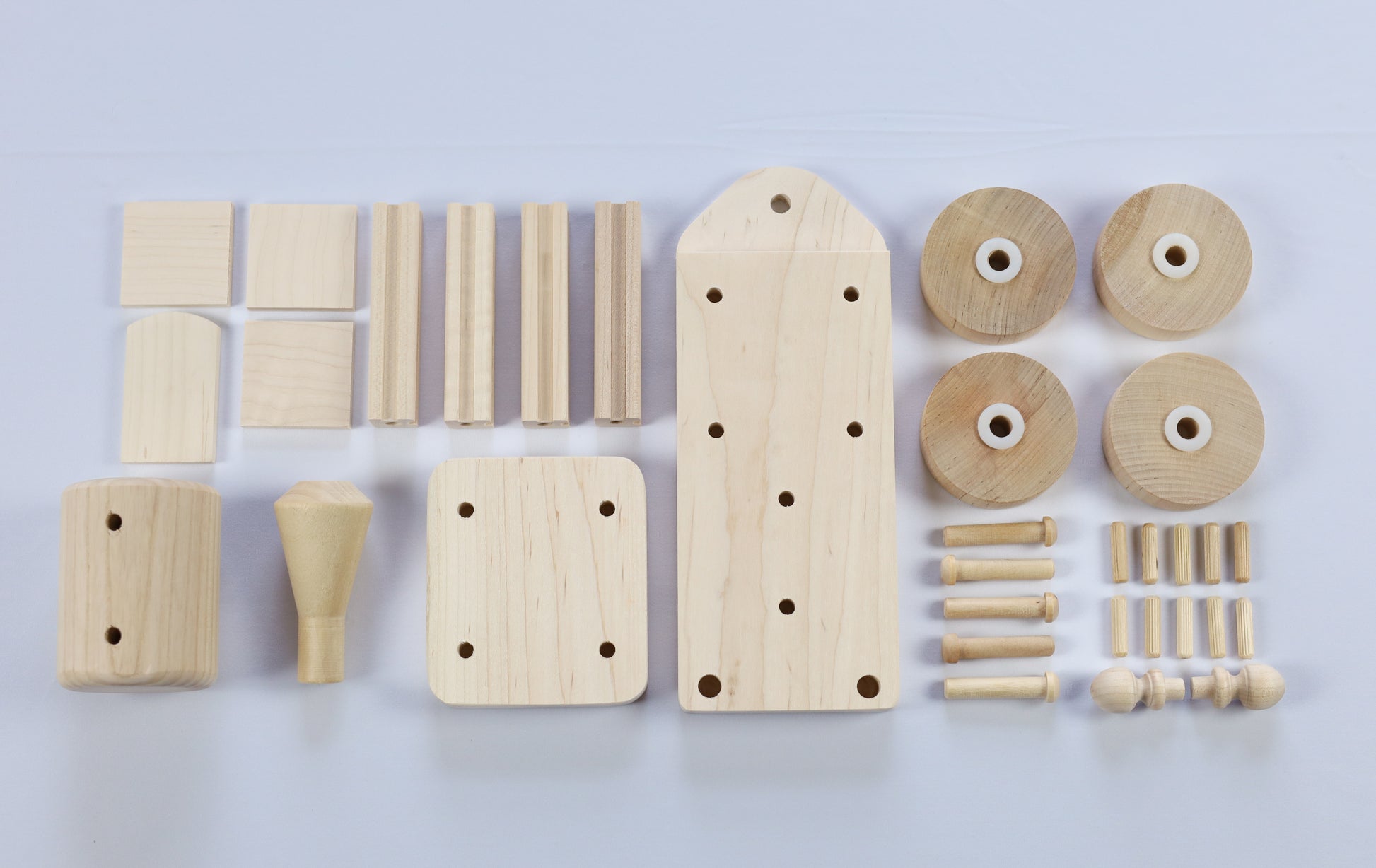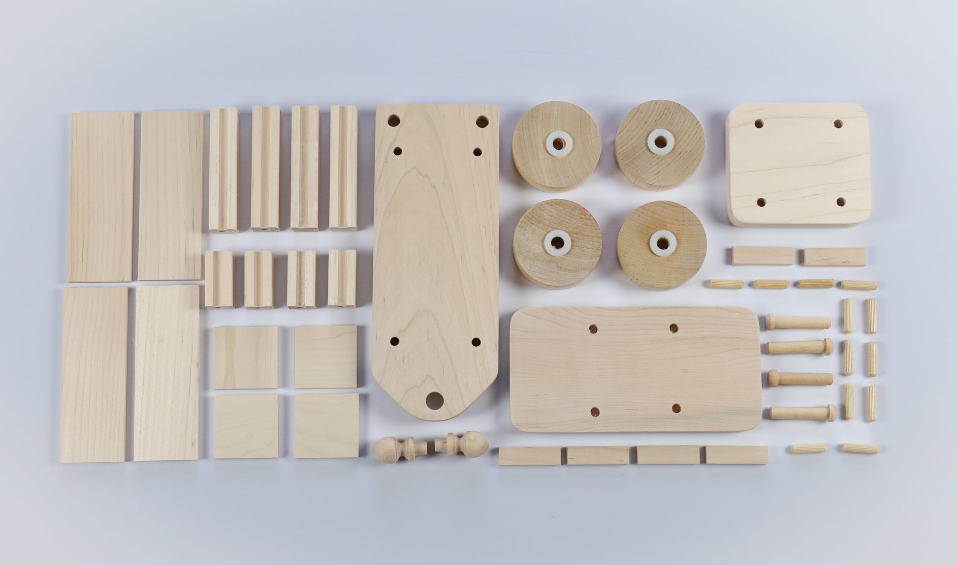 Kit includes 100 solid wood parts, 16 nylon washers, glue, sandpaper and a step-by-step instruction manual with QR codes for animation of each step. Your creativity will shine with your own choice of finish. Products for finish (paint, stain, polyurethane, etc.) are not included. Finished train overall dimensions are approximately 35 1/4" long x 5 3/16" wide x 7 7/8" high. Safety glasses, a file and a clamp (or a weighted item to help hold in place while glue sets) are required to complete the kit.