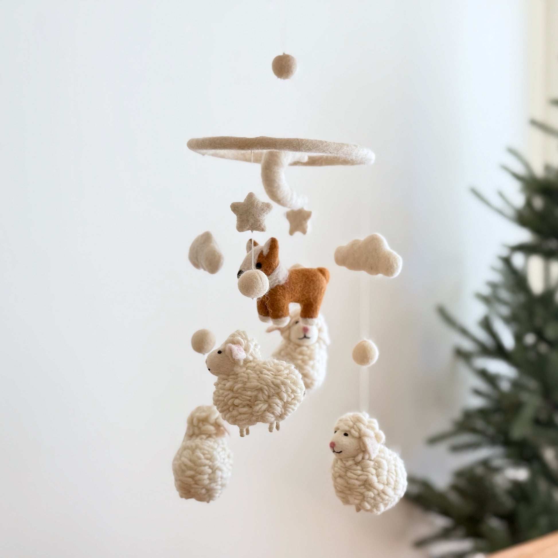 This handmade corgi and sheep baby mobile adds the sweetest farm-inspired charm to your nursery. Featuring a playful corgi surrounded by fluffy sheep, stars, clouds, and felt balls, this mobile is a cozy and whimsical addition to your little one’s space.