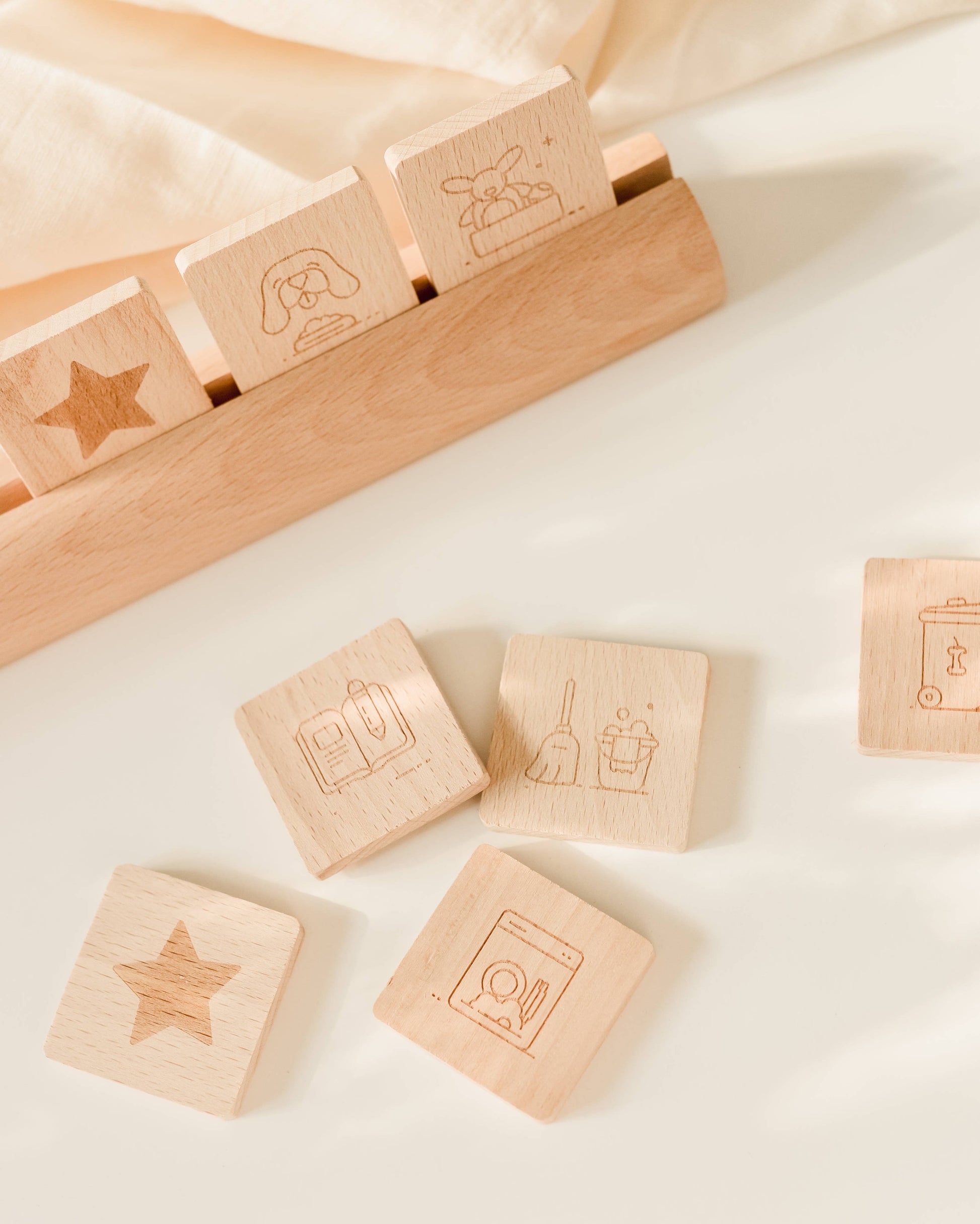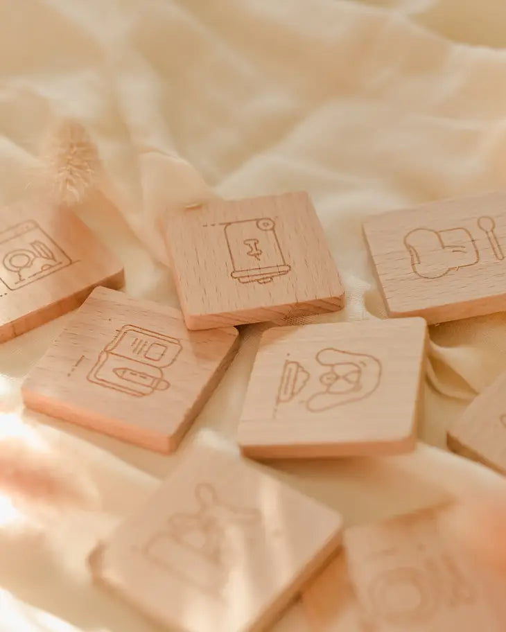 The daily routine set is made of 100% beech wood, at our FSC certified manufacturer. Our packing is made of FSC approved cardboard. The package contains 8 pieces of daily routine cards. The cards are 4,2 x, 4,2 x 0,6 cm.
