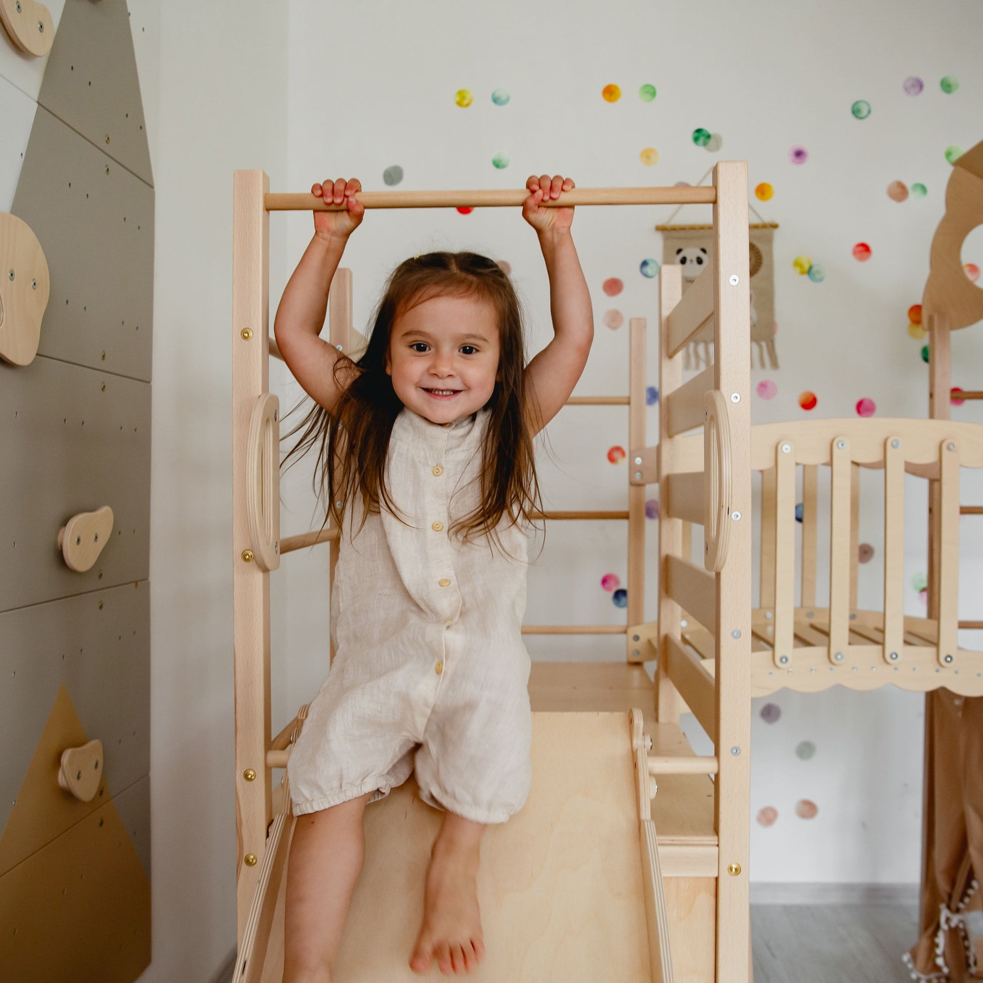 The Large Playground Climber offers endless play, exploration, and learning possibilities. Crafted from high-quality solid beech wood and birch plywood, it prioritizes safety and durability. Eco-friendly practices ensure the use of non-toxic, water-based paints and environmentally friendly varnishes. Meticulous hand-sanding guarantees a safe and healthy play environment.