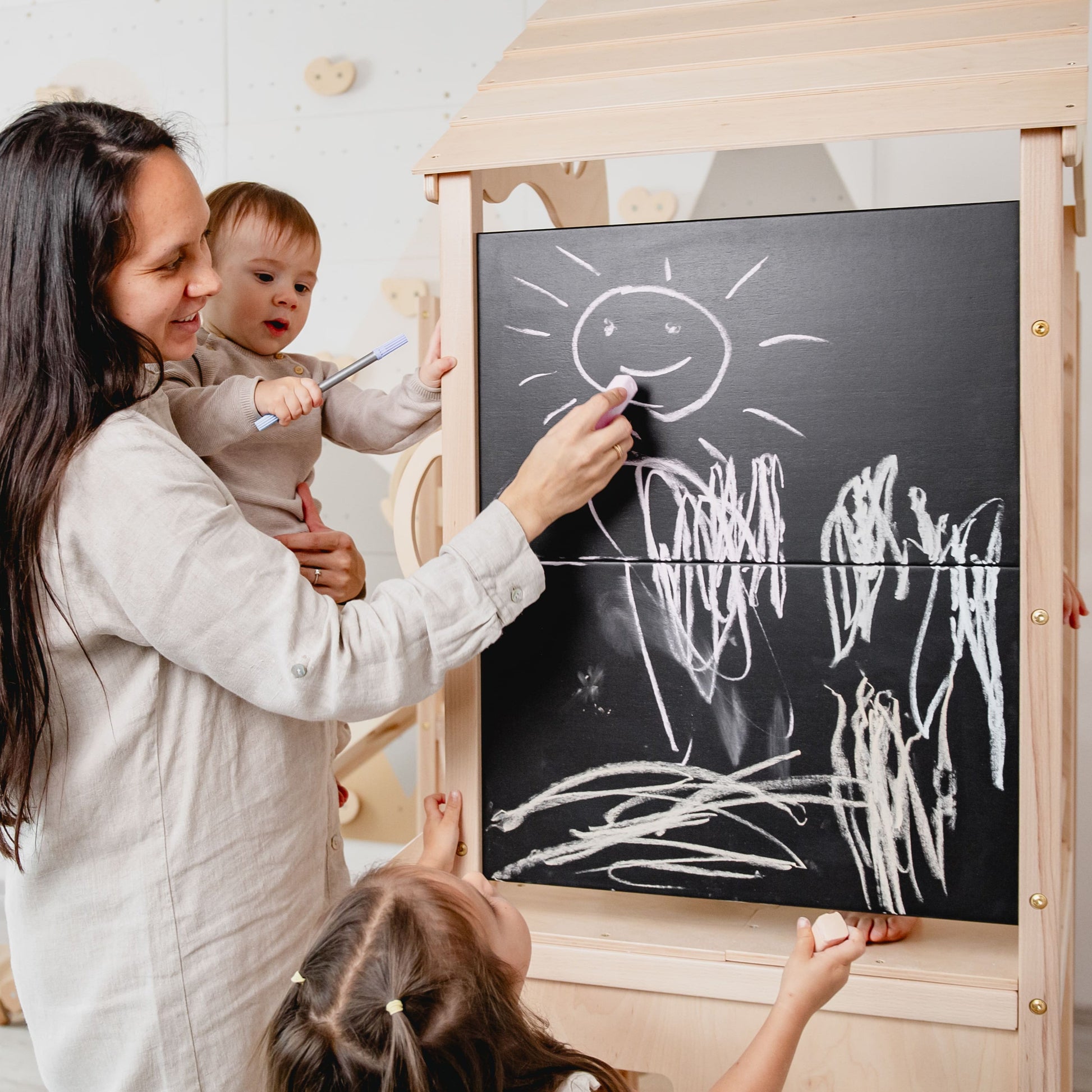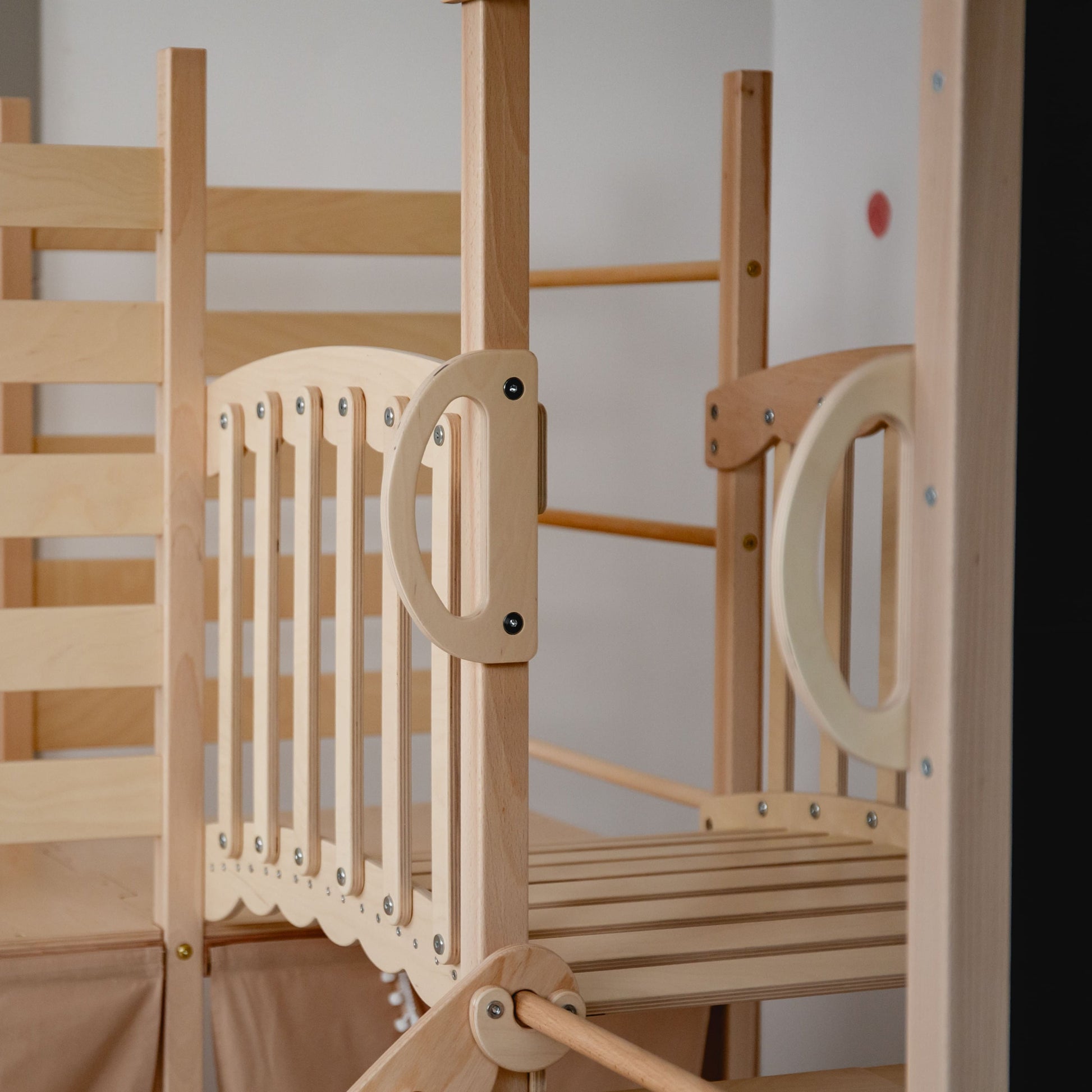 The playground for climbing features wooden ladders, a semi-arch, a safe bridge between two Tower parts, and even a drawing board. Two cozy houses with curtains are located on the lower level, providing a secure space for imaginative play. This functional design offers safe opportunities for play, with the position of the climbing arch being adjustable. The play complex can be easily complemented with a ramp-slide, and soft mats for cozy and safe play, adding even more fun and adventure to the climber.