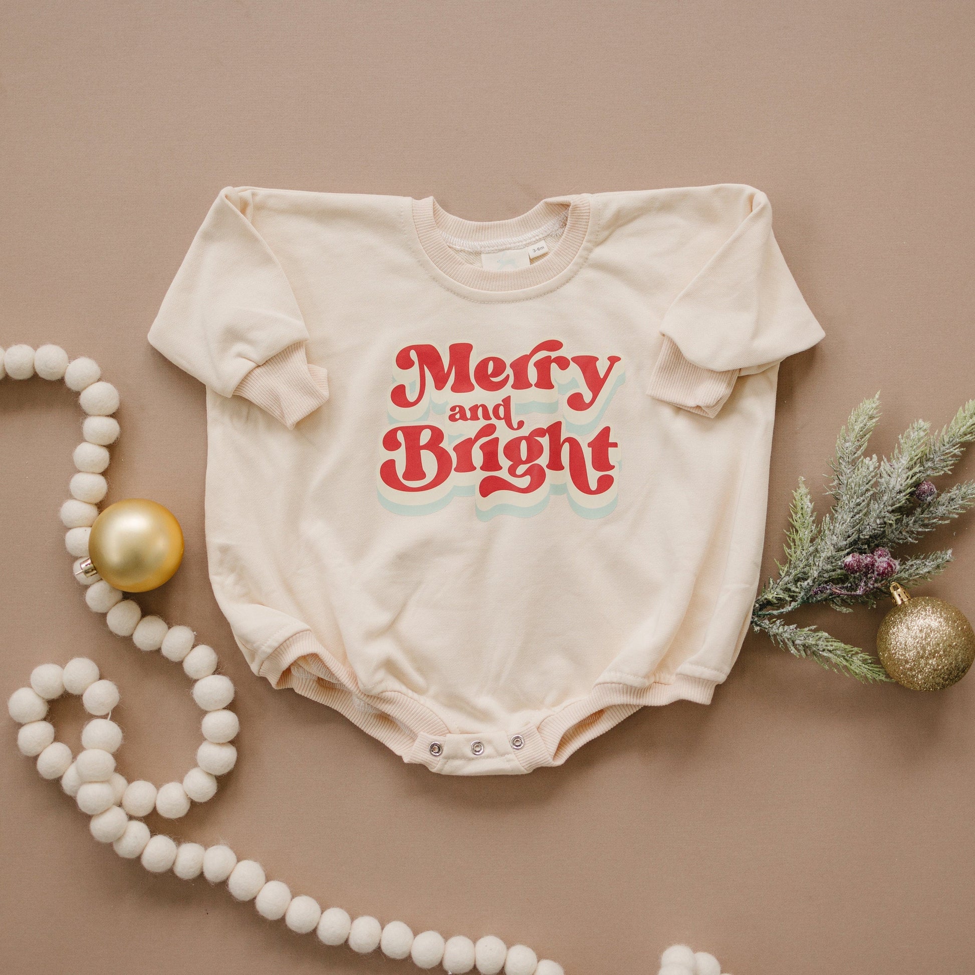 Merry and Bright graphic oversized sweatshirt romper with snaps at crotch. Lightweight terry material. Runs large.