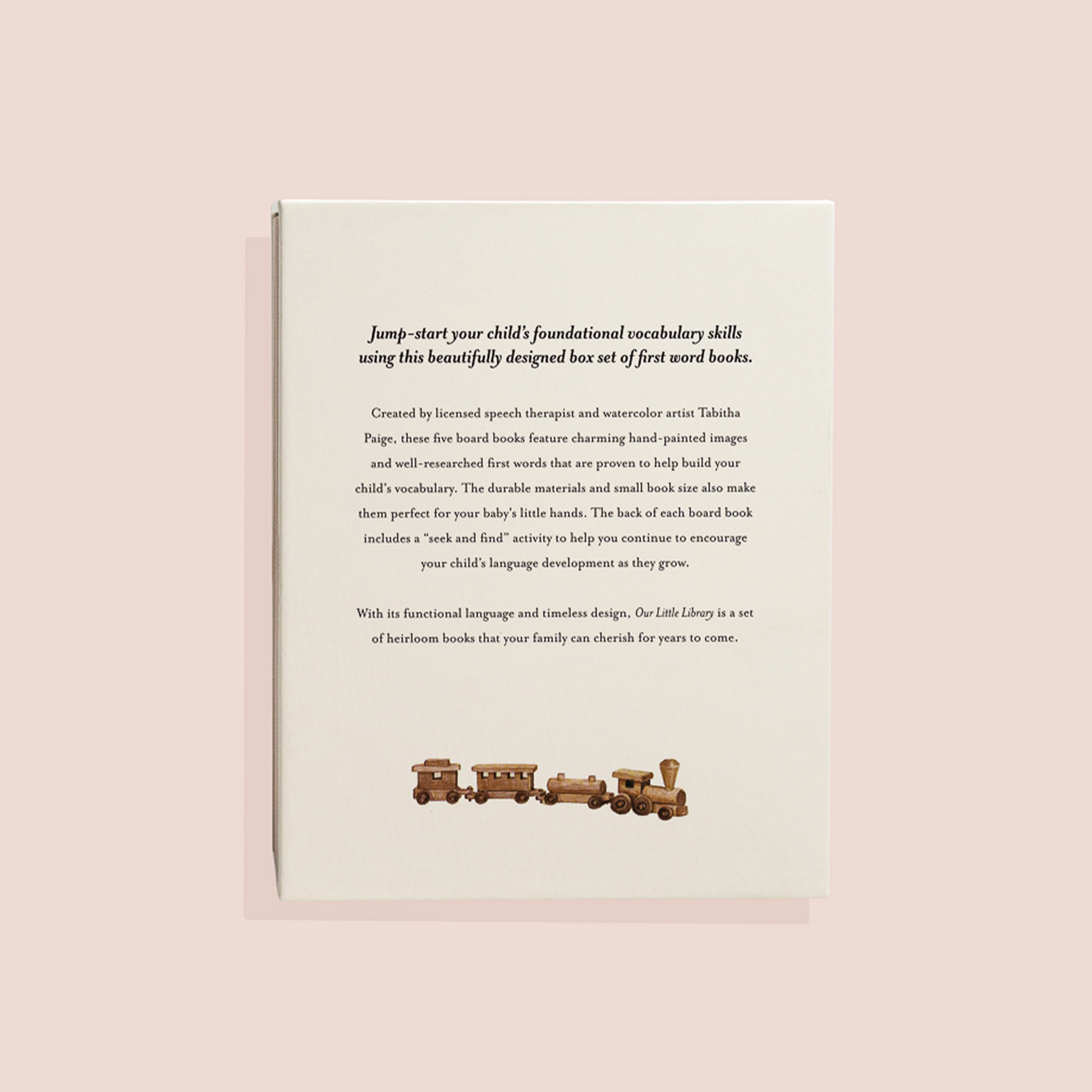 Designed by a professional watercolor artist and licensed speech therapist, Our Little Library features five board books that feature charming images and foundational vocabulary that will help you build your child’s vocabulary. The durable materials and small book size also make them perfect for your baby’s little hands.
