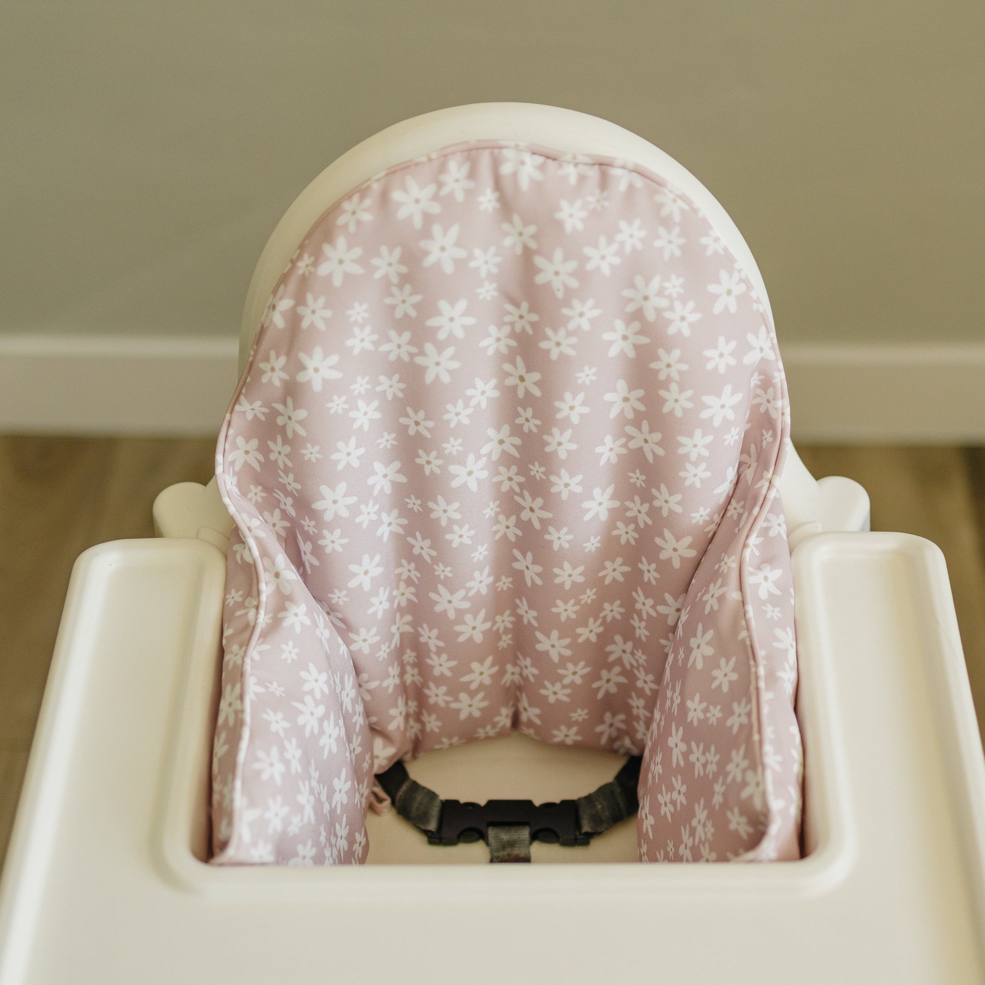 White Flowers on a pink background! Wipeable cushion cover for the IKEA Antilop Highchair