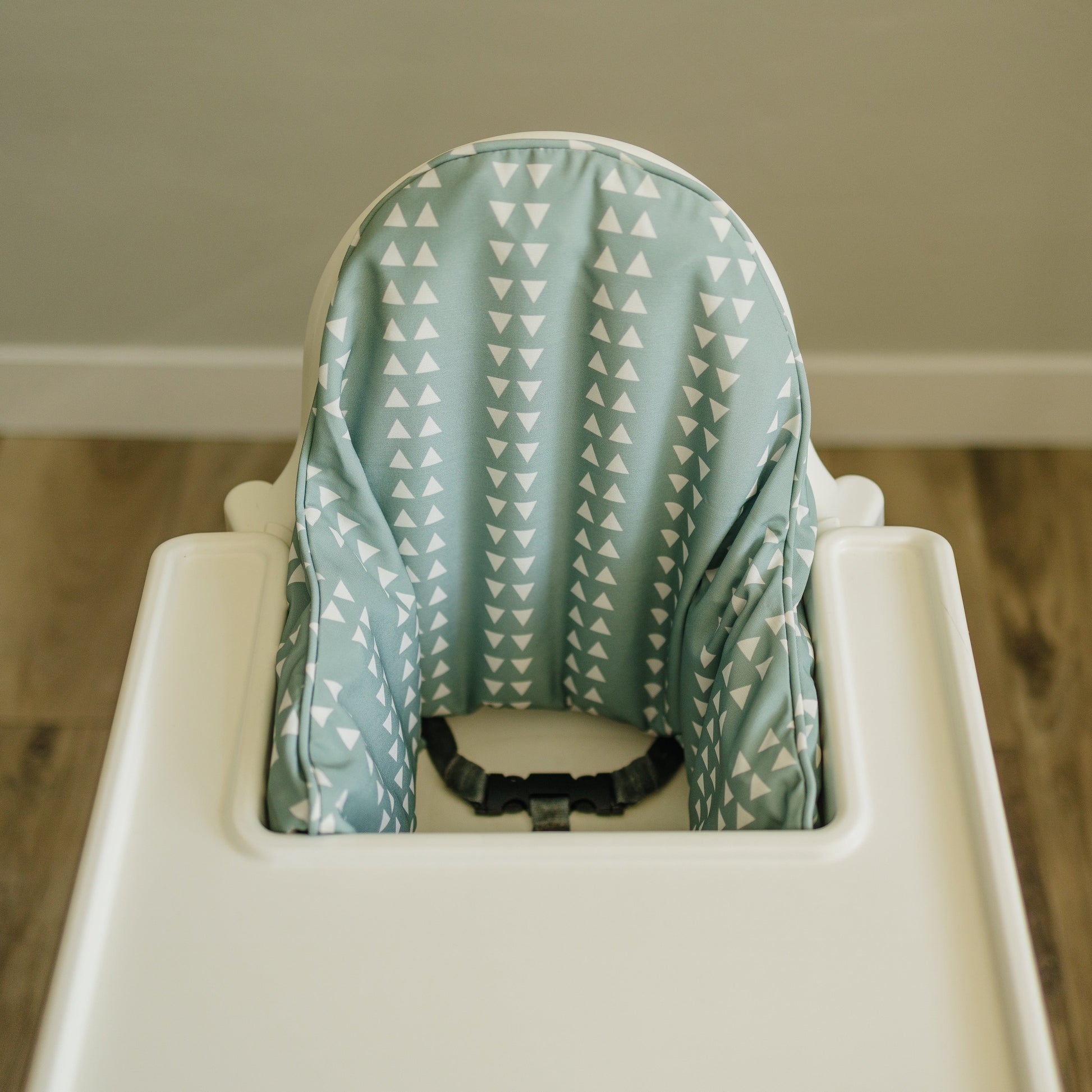 White triangles on a green background! Wipeable cushion cover for the IKEA Antilop Highchair