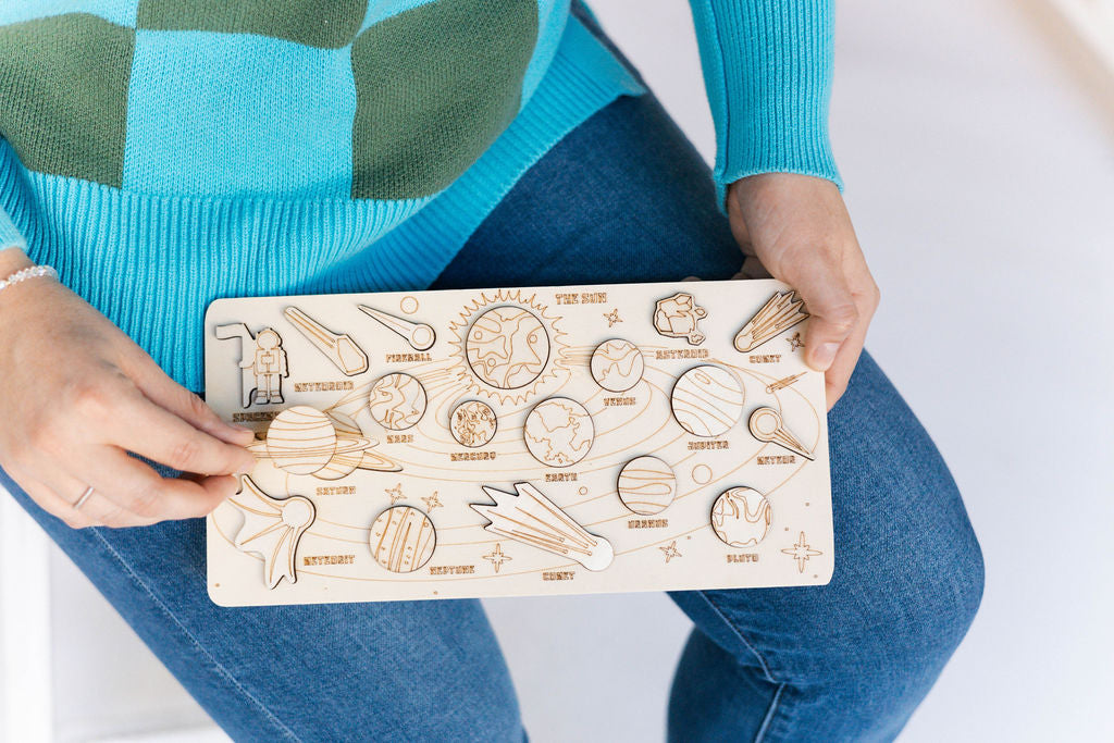 This space themed puzzle is a favorite with our young scientists! Learn the planets and find the matching grooves for the planets!