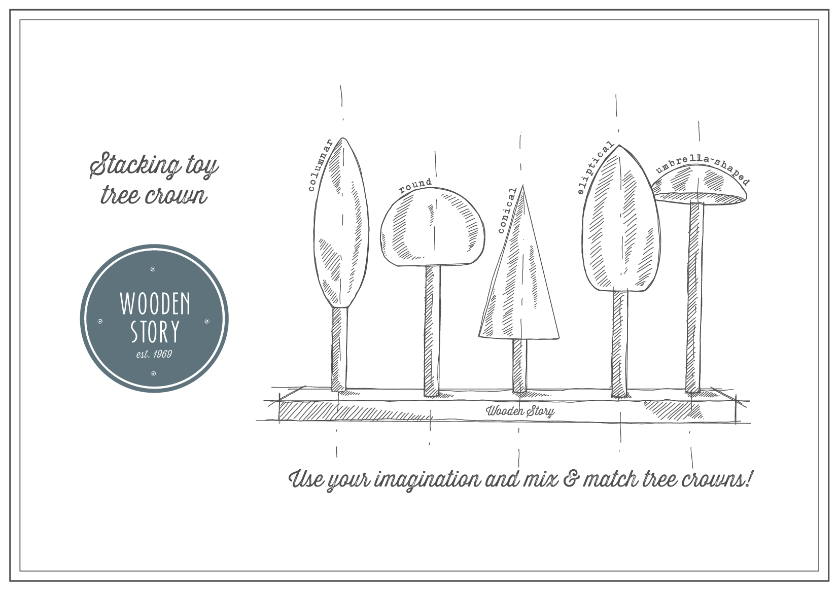 The wooden stacking toy "tree crowns" teaches how the shapes of tree crowns looks like. There are so many possibilities. Each stick (trunk) and crown are different and can be freely composed.