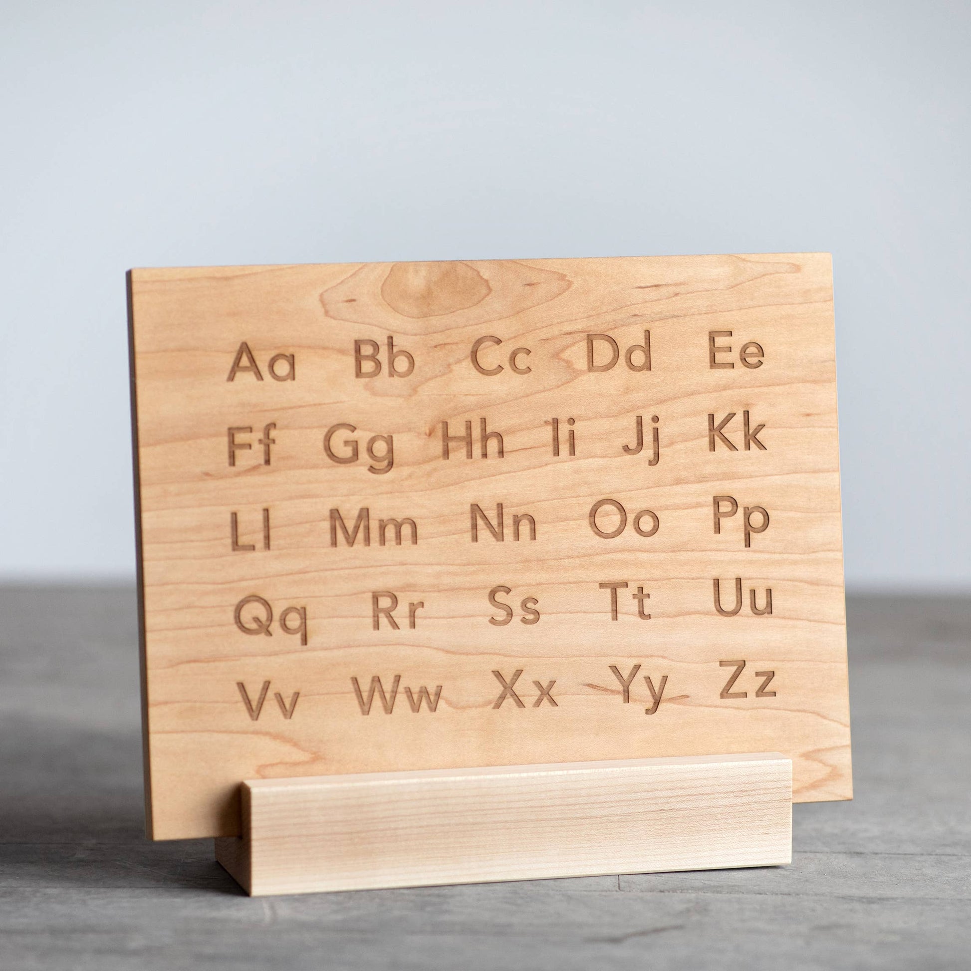 Our handmade wooden alphabet boards & display stands are designed with multiple uses in mind - as a tabletop reference board, a piece of art, a tracing tool, and a large, sturdy surface for practicing letter recognition or playing games. Inspired by Montessori-style natural materials and the concept of sandpaper letters, this engraved alphabet allows children to trace their fingers in the grooves of the wood and feel each letterform while absorbing the beauty of the alphabet (uppercase & lowercase) in a crisp, clear, easy-to-read sans serif font. Our wooden boards & coordinating stands are crafted by hand in our Ohio studio from locally sourced wood. Sealed with food-grade mineral oil and safe for babies & children to enjoy. Made from plywood & hard maple. Our line of modern learning resources are a lovely addition to a playroom or homeschool environment & are sure to be treasured for years to come. Each item is unique and made-to-order; wood tone & grain will vary from piece to piece.